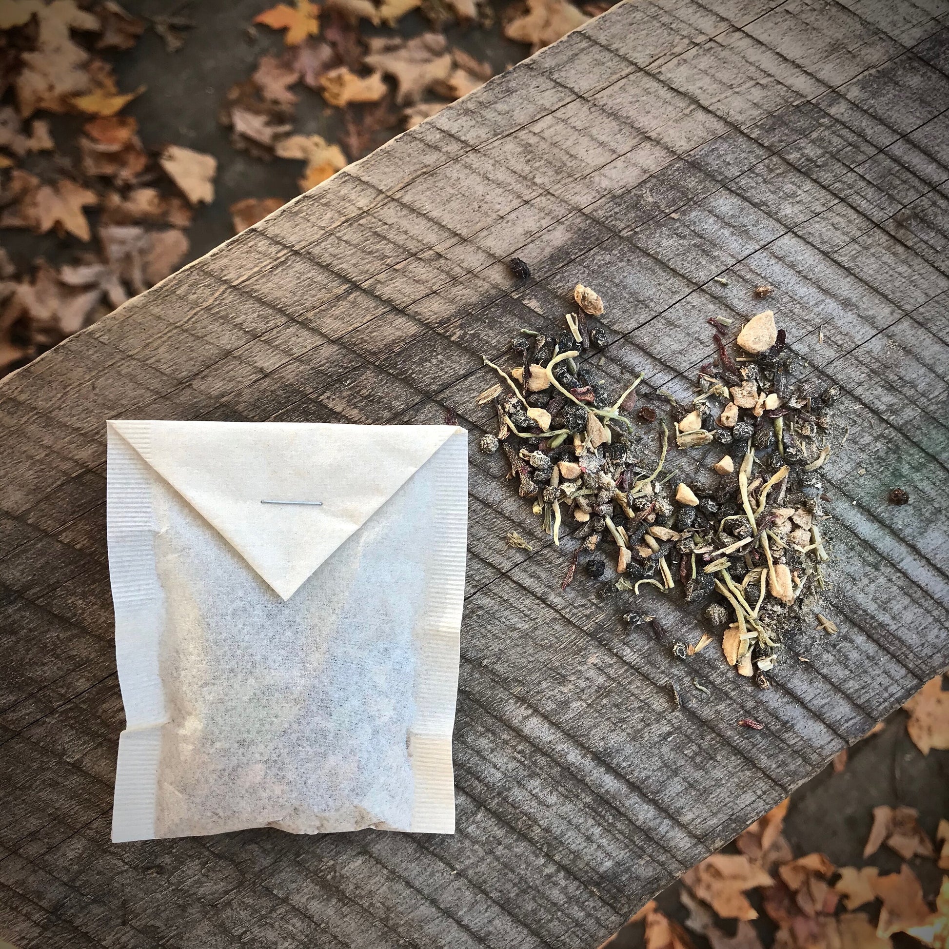 Our unbleached tea bags are sealed with a food grade staple and no chemical sealant. Each is compostable, as well as the herbs inside, once staple is removed. They love to return to the earth.