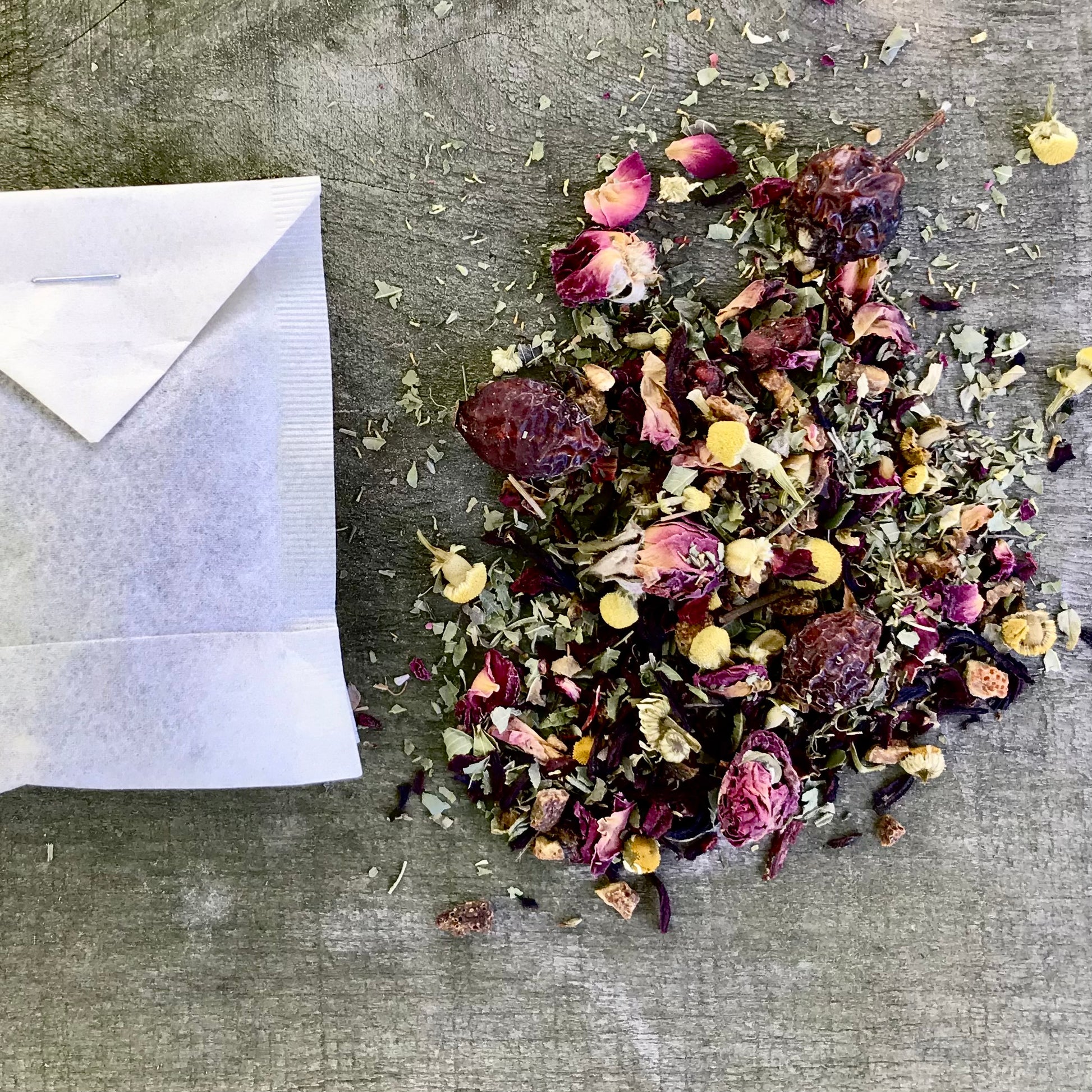 Our unbleached tea bags are sealed with a food grade staple and no chemical sealant. Each is compostable, as well as the herbs inside, once staple is removed. They love to return to the earth.