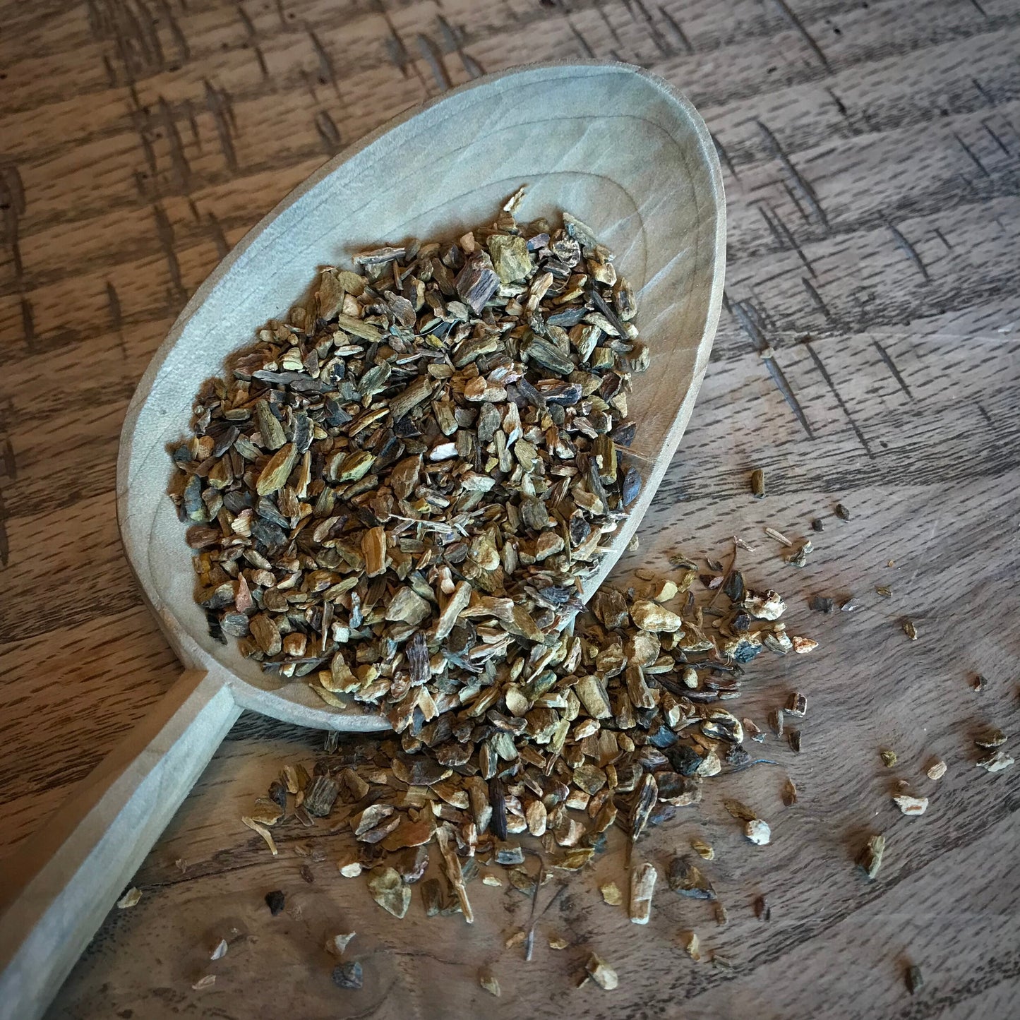 When do I think of Yellow Dock? I think of it often because its one of our dear natural neighbors in our front yard. I love to see the brown seed heads in the fall because that means its time to gather me some and make flour from them. I also think of the root which we have here when someone is having trouble absorbing iron. Not only does it contain iron, but it seems to help the body better absorb it as well. Probably my favorite thing about this herb is its digestive supportive strength too. It really has shown to help many folks dealing with regularity. It isn’t a laxative, but rather, it often helps to bring regularity. There is definitely a difference.